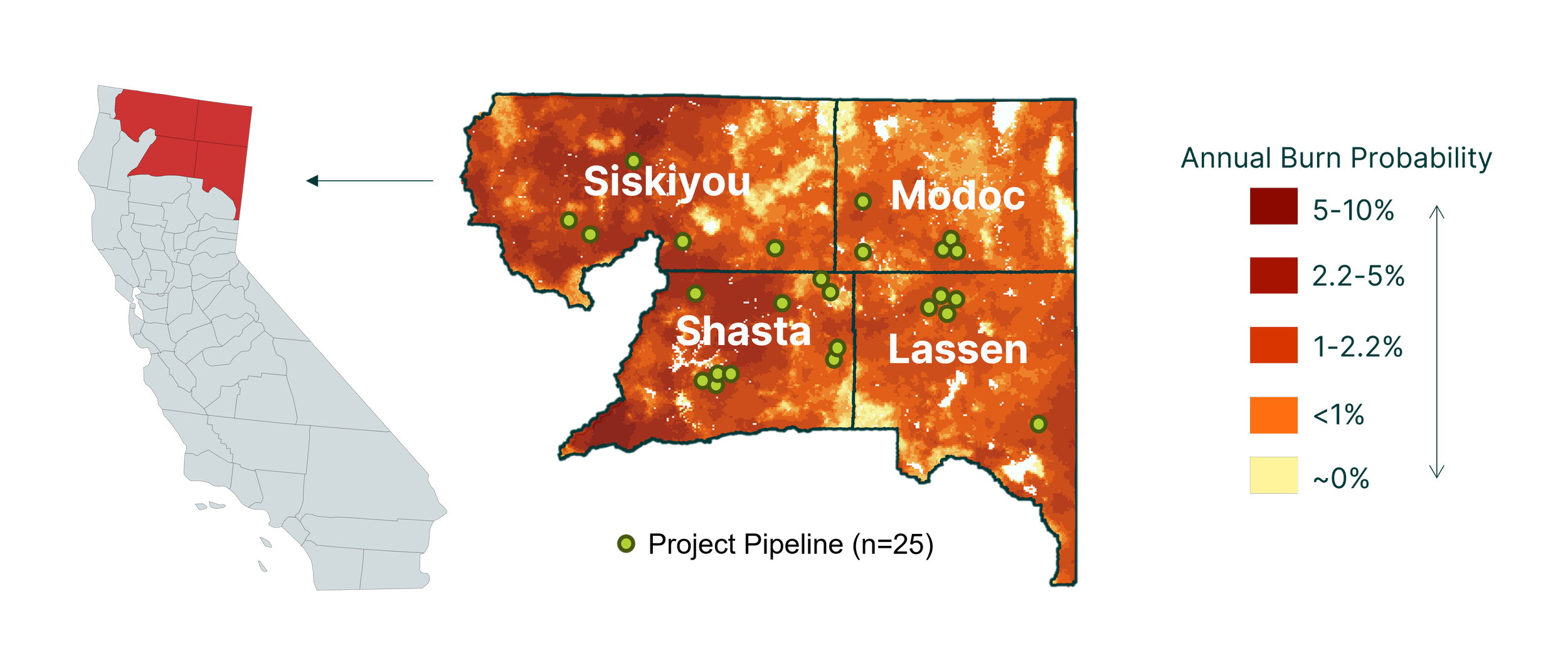 Our pilot program is actively testing two new wildfire mitigation crediting approaches. In total, 25 small landowners will be aggregated, covering 2,000 acres in areas of high annual burn probability